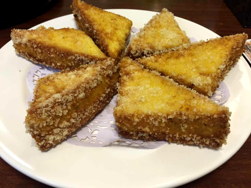 你见过这般独有风情的吐司吗?柔软的面包片经过炸制后酥脆焦香,甜嫩的番薯泥作为馅料,口感软糯,细腻柔滑。外酥里嫩的口感最能满足味蕾。最后在吐司外层撒上面包屑,这般独具匠心的佳肴,来老城一锅,你怎么错过!