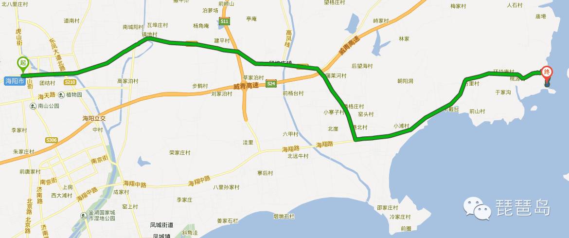 ①海阳市留格庄镇留格庄村立交桥下高速-------左转海核一路------第一个红绿灯左转风霞线------桃源村 和谐家园大石头沿左侧直走------沿环山路约2公里到达目的地