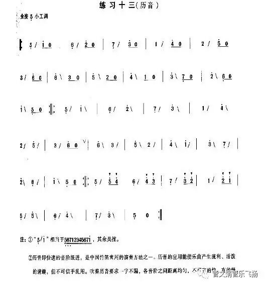 注:历音即快速的音阶级进,是中国竹笛常用的演奏方法之一。历音的应用能使乐曲产生流利、活泼的情趣,但不可信手滥用。吹奏历音要求一字不漏、各音阶之间距离均匀、不可有的快、有的慢。