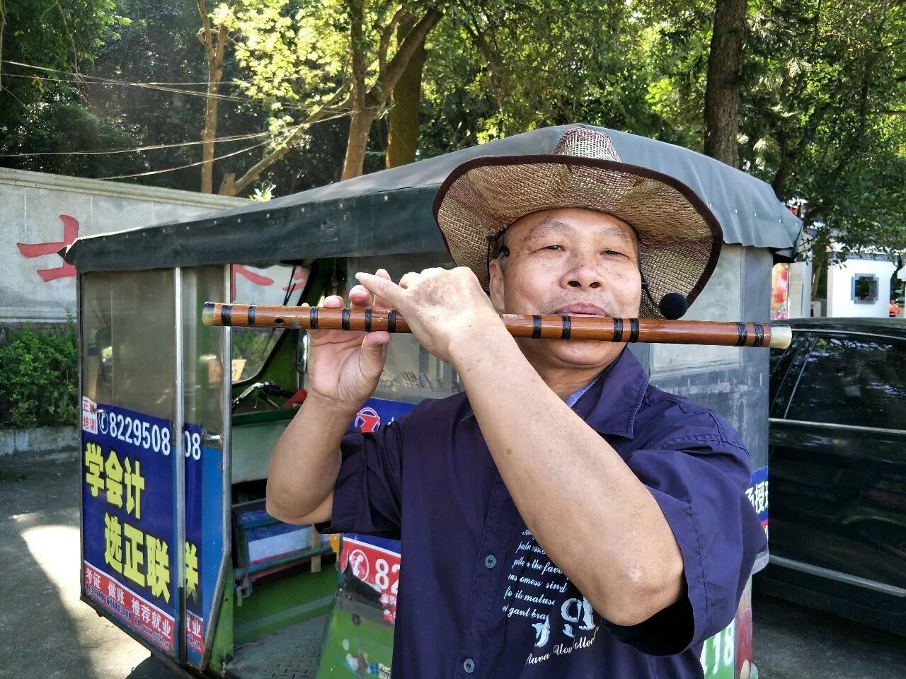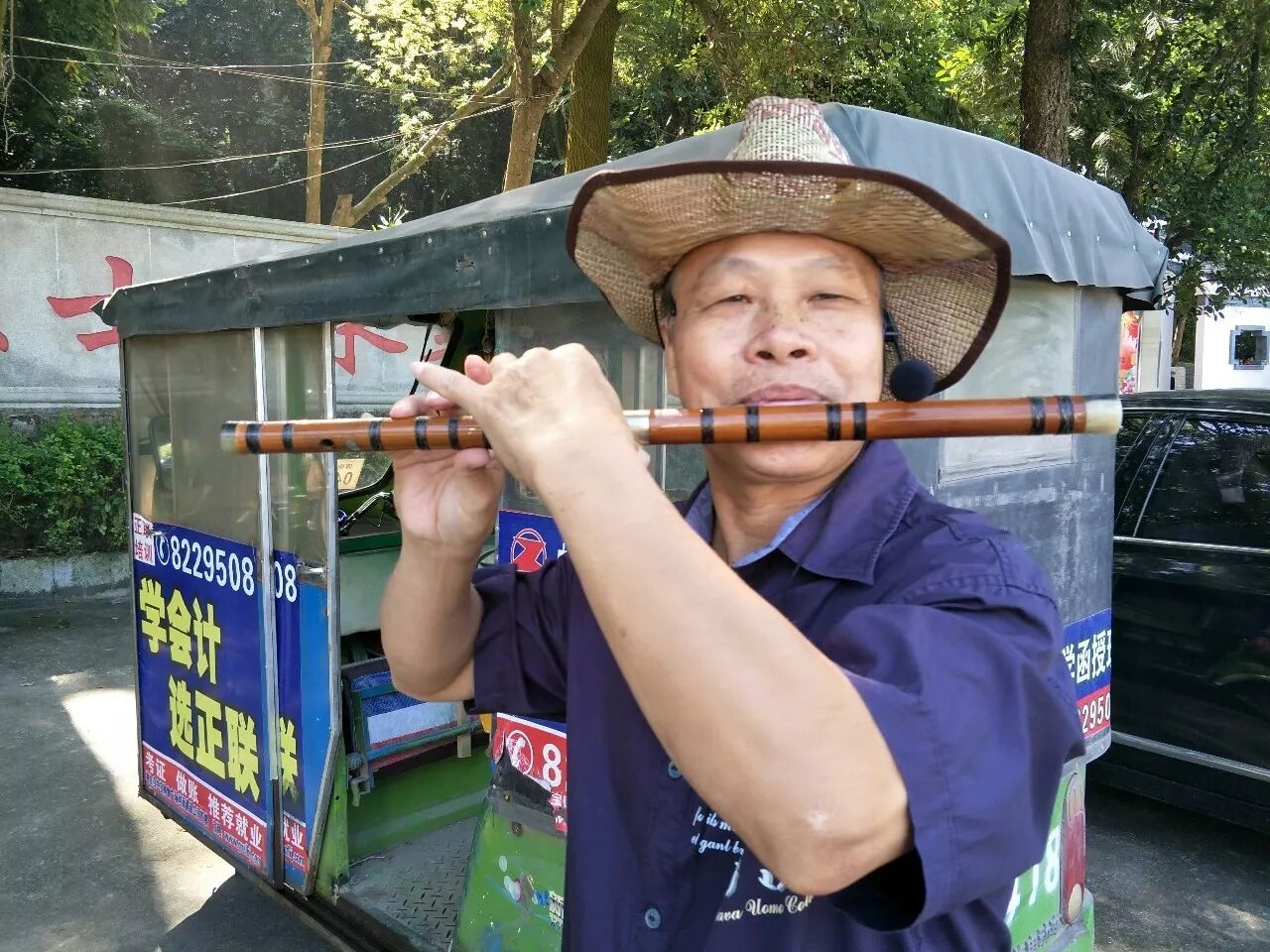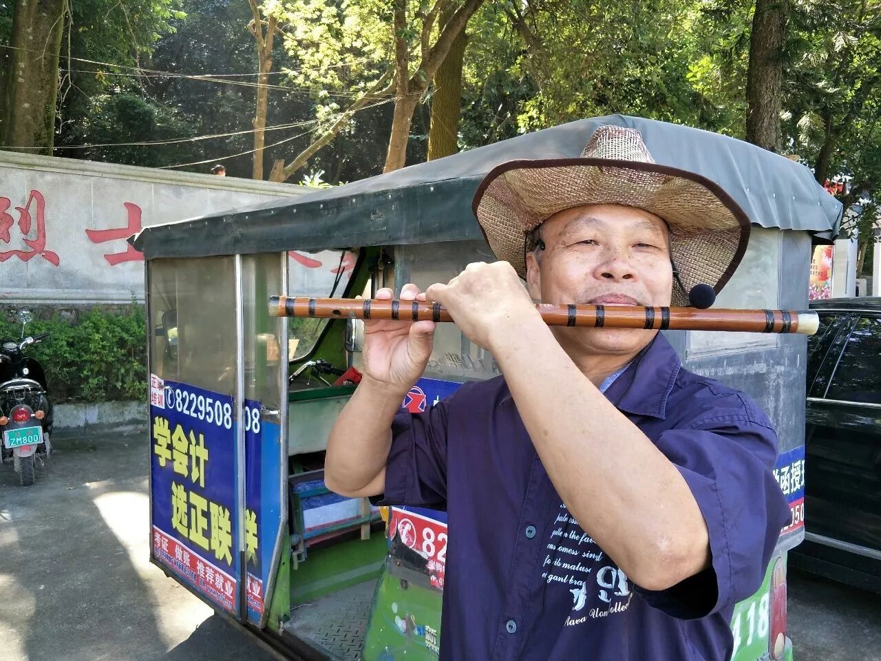 2017年10月13日,早上在公园锻炼的时候,看见一个三轮车上有一位出租车司机在三轮车内部吹笛子,笛声悠扬,很有穿透力,我禁不住一步往前一探究竟!
