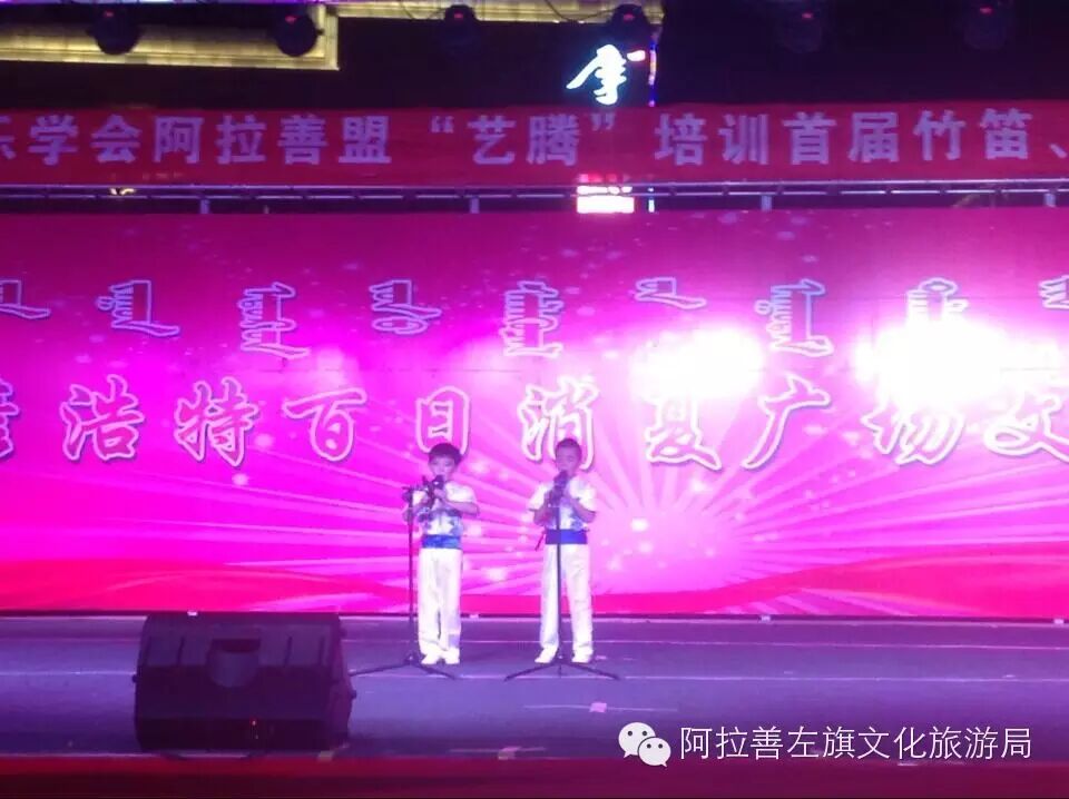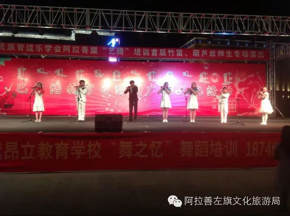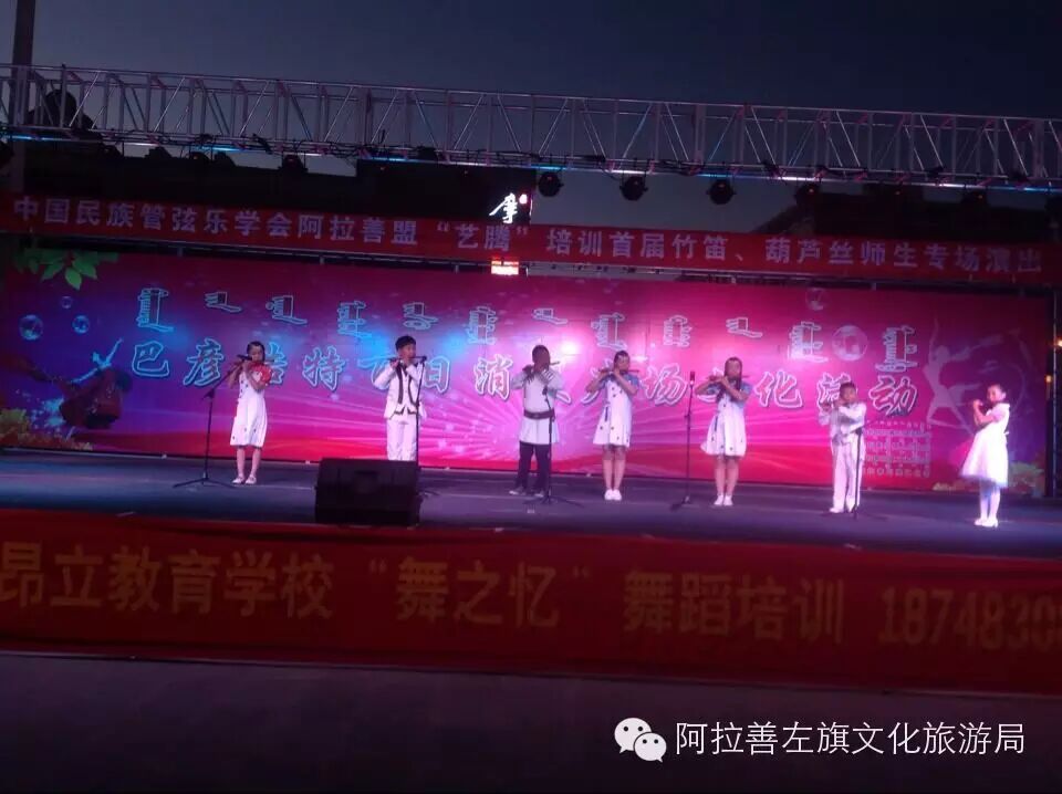 为更好的开展文化服务基层工作,2015年7月26日在阿左旗体育场进行了阿拉善盟首届“艺腾”培训师生竹笛、葫芦丝消夏专场演出,本次演出邀请了内蒙古艺术大学专业老师韩占坤、刘云鹏、徐俊东及阿左旗乌兰牧骑笛子专业演奏员黄兴科在各学校培训、辅导的学生。