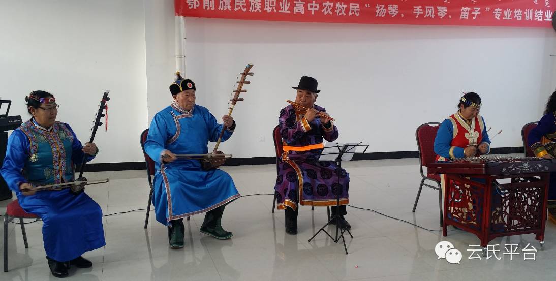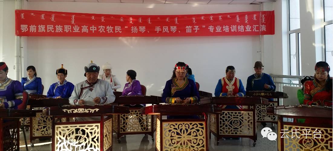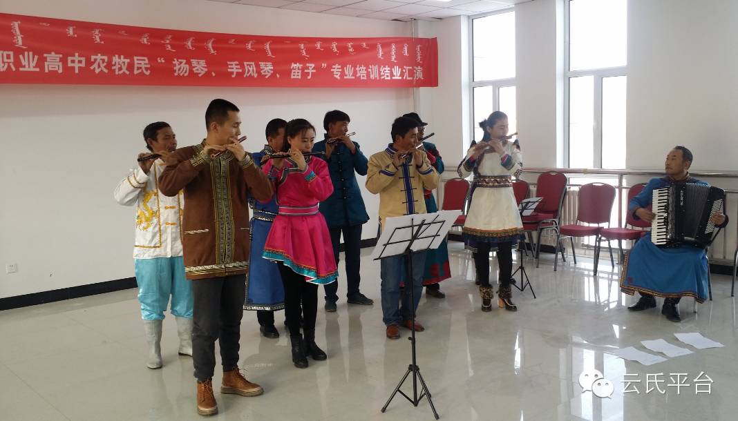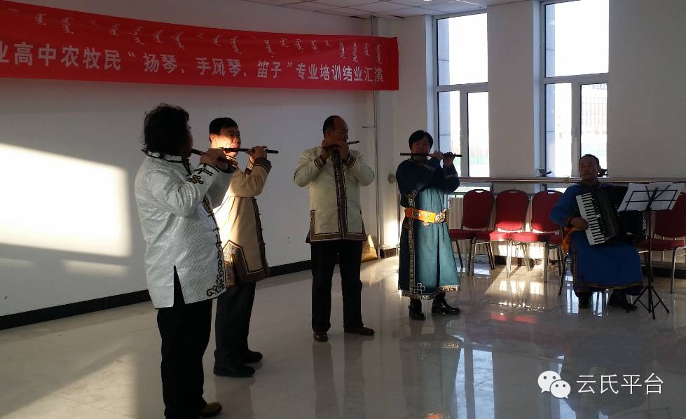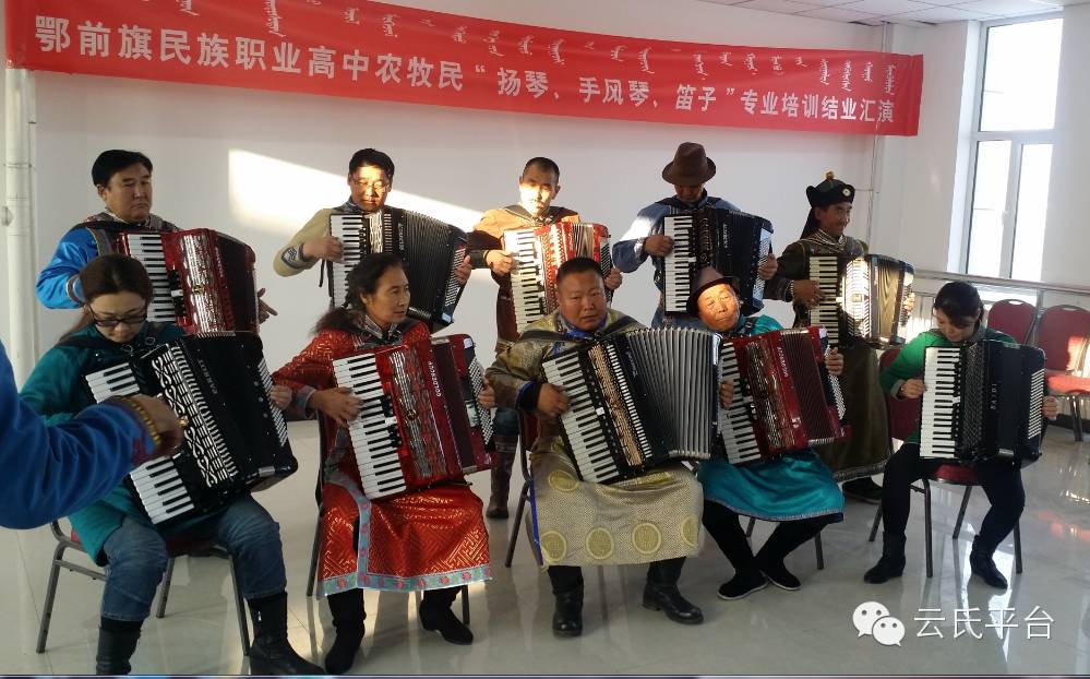 鄂前旗民族职业高中在旗民族宗教事务局、旗广播电视局等部门的大力支持下,圆满完成我旗首届农牧民“手风琴、扬琴、笛子”培训工作完成预期目标任务,今天圆满结束两个月的培训工作,在任课教师的细致的教学,广大农牧民朋友努力学习,有的学员每天80公里以外来回奔跑,同时克服天寒、大雪、大雾等恶劣天气,学到和奠定了良好的基础知识,部分学员达到一定的演奏水平。这是我校领导班子的正确领导和广大教职工的共同努力,学校培训处工作人员的细致工作,我校各项培训工作取得良好的社会效益的同时受到上级有关部门的大力支持和很好的评价。