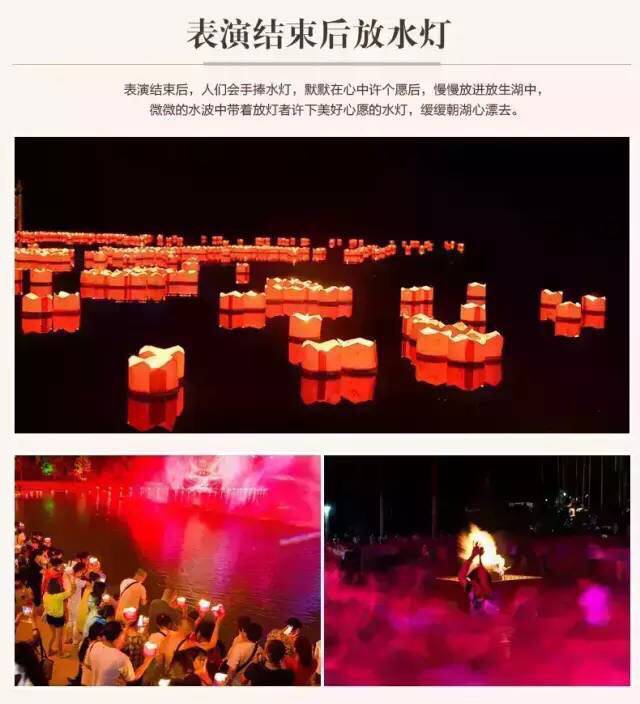 节目结束,每个观众都可领到一盏许愿灯,许过愿后,在漆黑的夜里,来到公园湖边,放入水中,在一个信奉的国度,许下自己心中最美好的愿望,这一场面十分壮观,相信是你此生从未有过的一种感受。