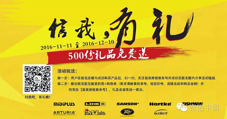活动参与品牌: FISHMAN、 MIDIPLUS 、 LINE6 、SAMSON 、 HARTKE 、 PEAVEY 、 Arturia 、Audient、 Black Smith