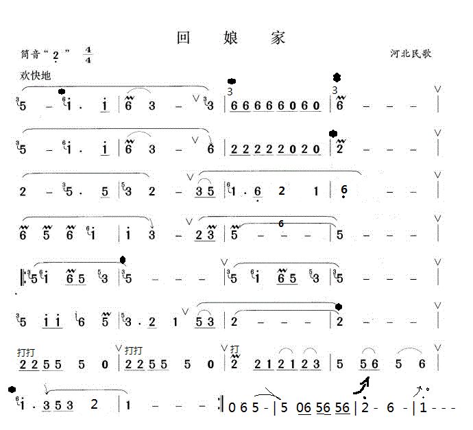 回娘家,在中国北方又称走娘家。是一种很有特色的汉族岁时风俗。每年正月初二、初三,中国各地汉族同胞出嫁的女儿要回娘家,夫婿要同行,所以俗称迎婿日。它反映的情意却甚浓,真正的是“礼轻情意重”,姑娘对乡亲的切切的思念。小梆笛音色高亢明亮,花舌、躲音的运用,更是小曲热情欢快!