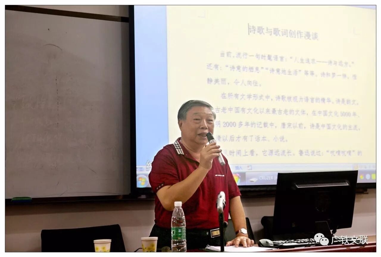 接着我们身边的大作家大诗人蔡宗周老师,和我们一起分享《诗歌与歌词创作漫谈》。不愧是中国作家协会会员、一级作家,蔡老师倾其所有地告诉我,要用艺术的眼光观察生活,生活是创作的唯一源泉。用形象的思维感受生活,用精巧的构思来反映生活……
