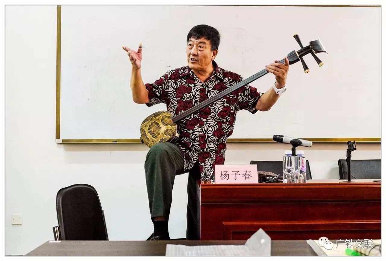 不等集团音乐舞蹈曲艺家协会主席姜维波班长(对,此次培训班的领头人)介绍完毕,杨老师就操着标准的“京片子”,眉飞色舞地讲起《曲艺创作与快乐人生》。 杨老师真心是个奇才啊。讲着讲着,麻麻利利地将假指甲绑缠上拇指与食指,操起三弦琴,唱起单弦《节马颂》。连说带唱,弹挑扫轮,硬生生带着我们,穿越回到第一次鸦片战争中的沙角炮台。硝烟弥漫中,隐约听闻节马黄骝向北悲鸣。