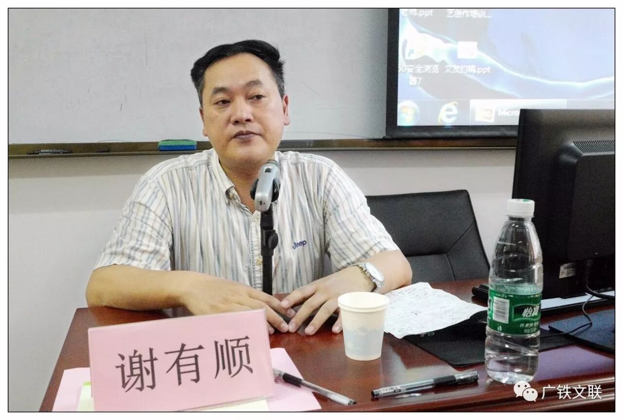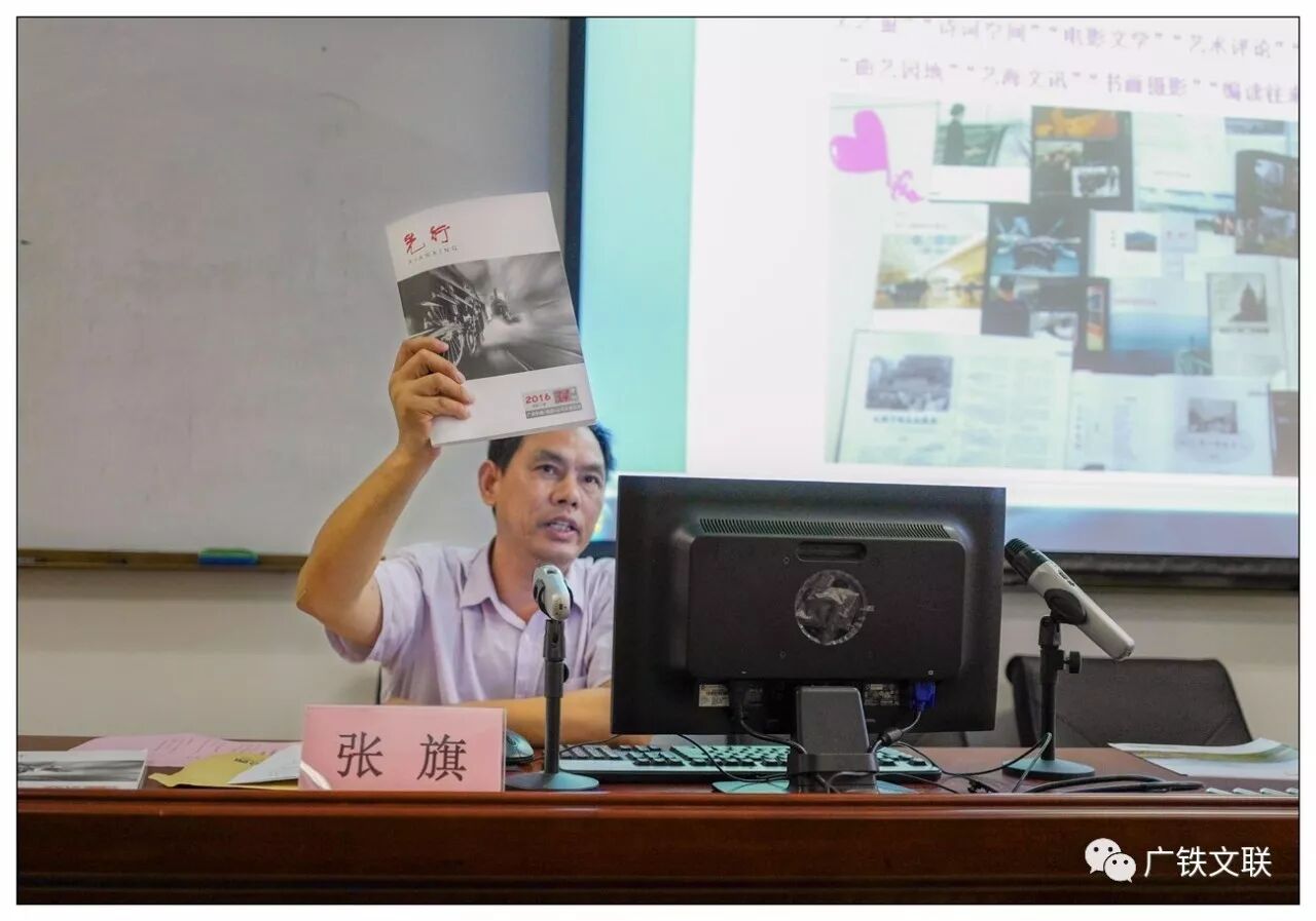 张旗老师还在介绍《先行》的办刊宗旨——“立足广铁,面向基层,培养广铁作者,推出铁路精品”——那边广东省曲艺家协会主席杨子春老师,已经急吼吼地等待出场。