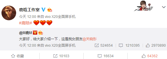 并且鹿晗关晓彤双方的工作室都分别转发加爱心表示祝福