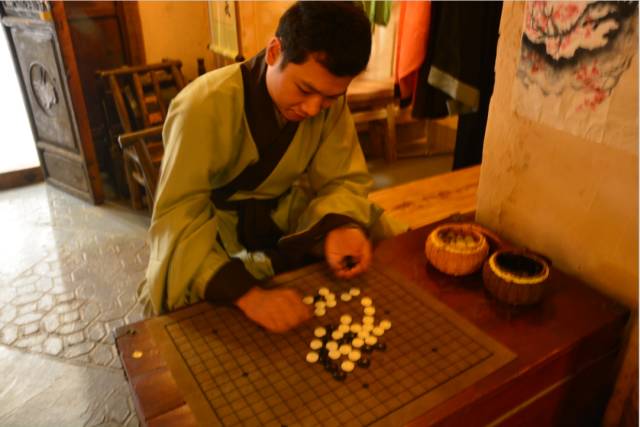一名宽衣博带的先生寂寞地坐在棋盘边