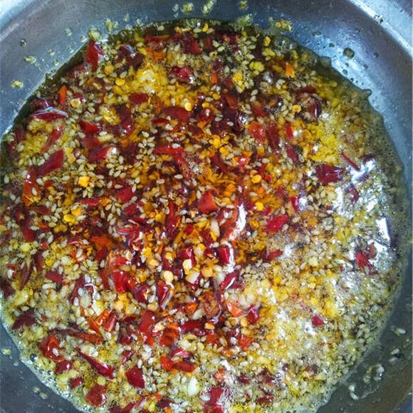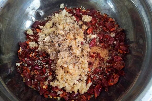 【材料:干辣椒(30g)、菜籽油(50ml)、盐、姜(15g)、白芝麻、大蒜(5瓣)
