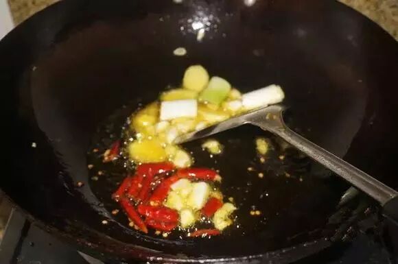 3.锅内倒入油,油热后下入葱段、姜片、蒜、干辣椒煸炒,放入1小勺豆瓣酱煸炒出红油