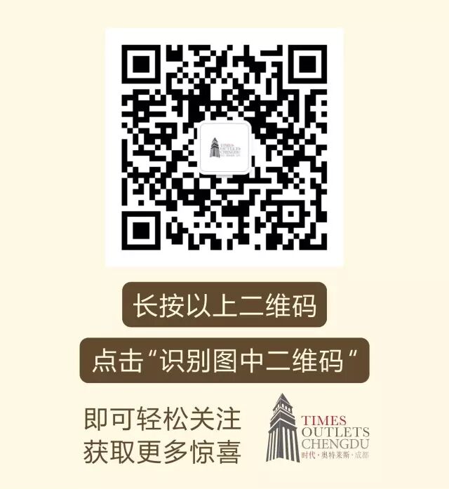 点击右上角“查看公众号”/搜索微信公众号“时代奥特莱斯”营业时间:10:00-21:00地址:成都市双流区双楠大道中段633号客服电话:028-61915111