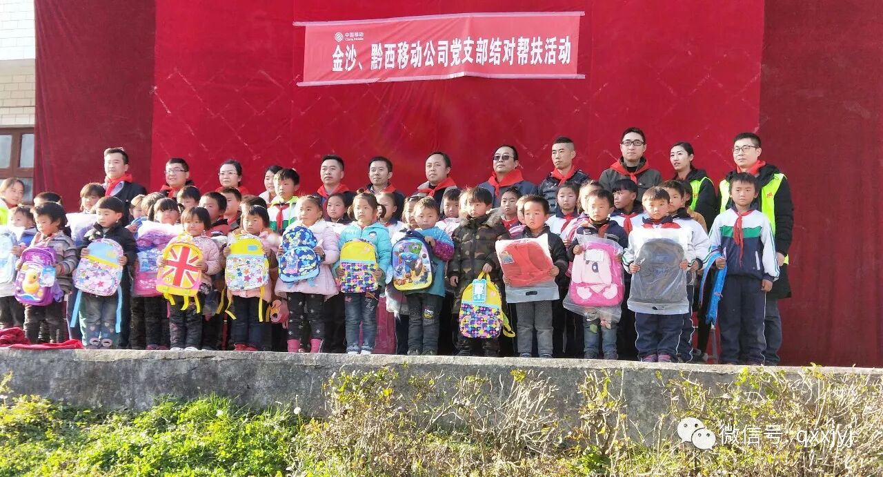 该乡党委副书记乡长杨平、金沙县移动公司党支部书记经理段建忠、金沙县移动公司党支部书记纪检委员副经理潘刚、黔西县移动公司党支部副书记方世红、移动公司青年志愿者及铁盔小学全体师生出席捐赠仪式。一个个崭新的书包从志愿者手上发放到留守儿童手里,传递着移动公司的大爱。