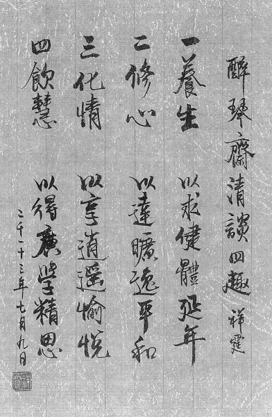 1957年的暑假,李祥霆来到北京查阜西家学琴。不但不需学费,查老还带着他去北海庆霄楼参加昆曲会月集、逛琉璃厂的古书店、书画店。有一次,他在院中看到查老在门前高台上一针一线地缝扣子,他感受到家庭的温暖,又充满对贤者的敬仰。