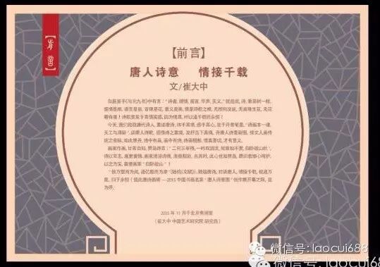 “唐人诗意,情接千载”---唐诗宋词元曲是中国文化的重要支点,画唐诗,读唐诗,重温唐诗遗韵,是对中国文化、中国精神、中国魂魄的最好阐释之一,是贯彻和落实党的十八大和十八届三中、四中全会精神,,是传承和弘扬发展中华传统文化,坚守中华文化立场的一项重要策略,是上通时代文艺殿堂下接民间地气的重要艺术实践。在当下文化形态日益多样化,传统文化需要璀璨重生的今天,描绘唐诗大境,在诗中有画、画中有诗、诗画相彰中,领略唐诗之雅韵,感受绘画之优美,感悟中国书画和中华诗词的迷人艺术魅力,无疑具有非常重要的文化意义、学术意义和现实意义!