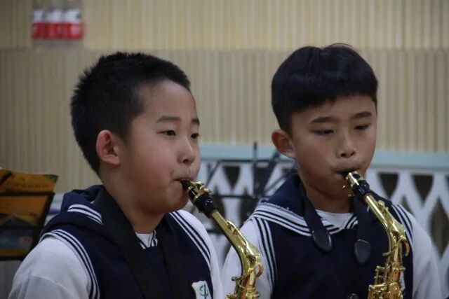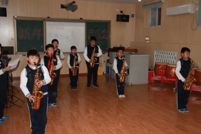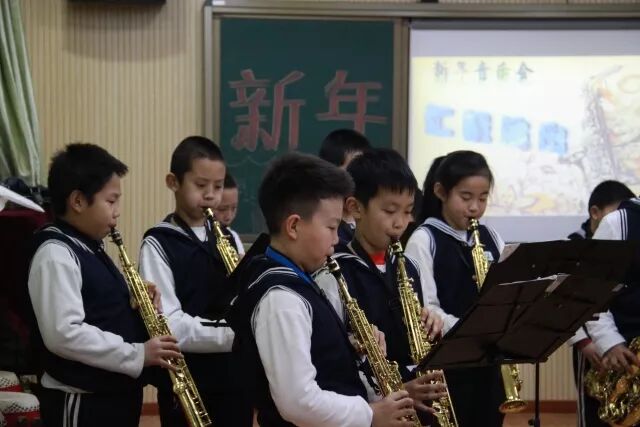 看!萨克斯社团的新年音乐会在欢快的打击乐赛马中拉开了帷幕,乐曲欢快激昂,仿佛把人们带到了一望无际的大草原。而后萨克斯C团的同学们吹奏了《绿袖子》、《苏珊娜》两首曲子,C团的同学是我校学习萨克斯时间最短的同学,但他们既不怯场也不紧张,有条不紊的表演博得了家长们的阵阵掌声。