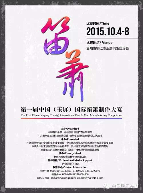 由中国音乐学院、贵州省铜仁市委宣传部、贵州省玉屏侗族自治县委、玉屏侗族自治县人民政府共同主办,中国民族管弦乐学会竹笛专业委员会、中国民族管弦乐学会乐器制作改革专业委员会、贵州玉屏侗族自治县委宣传部、贵州玉屏侗族自治县工业和商务局、,北京天博和音文化传播有限公司协办的第一届中国(玉屏)国际笛箫制作大赛即将于10月4日-8日在贵州省玉屏侗族自治县隆重举行。