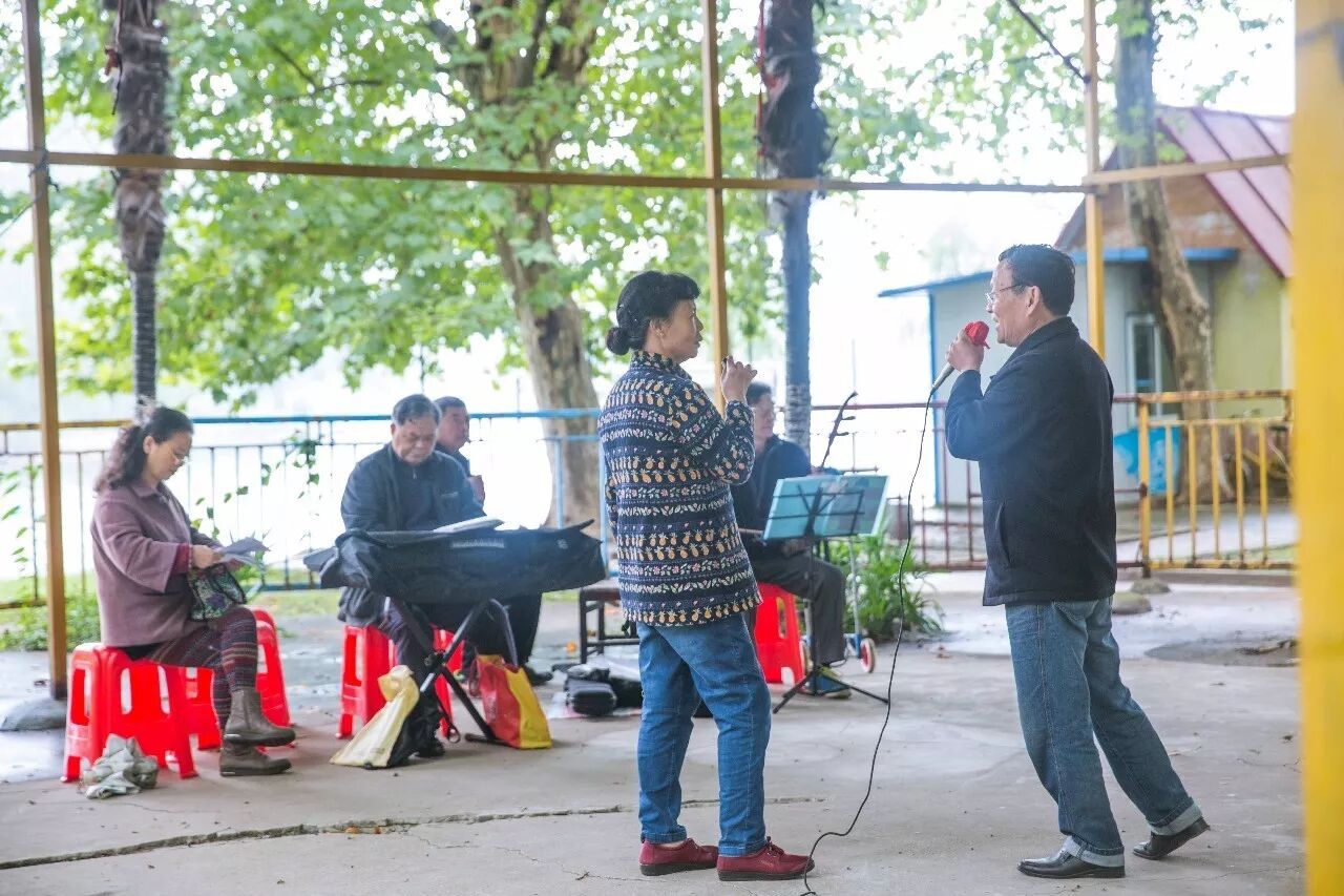 ,这样的“演出团队”随处可见,刚刚开始练习唱歌的都喜欢选在假山后面隐蔽些的位置,有经验的“歌手”一般都选在路边的凉亭,有时候碰到来交流的经验的,大家也很乐意互相分享,有时也可能被邀请一起唱上一曲哦!