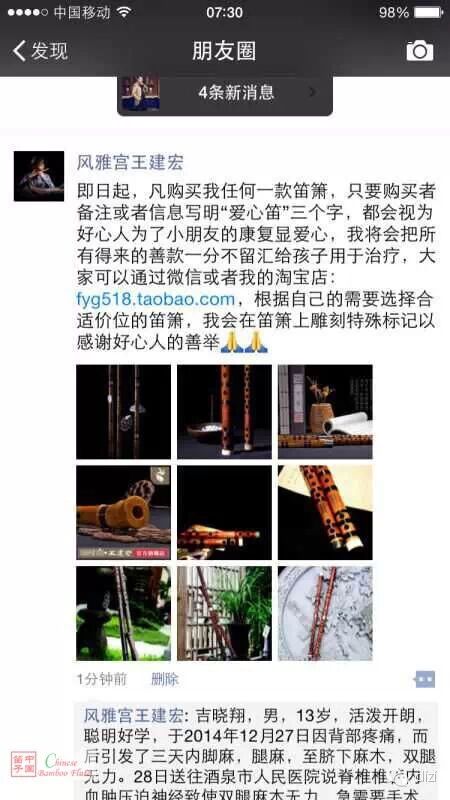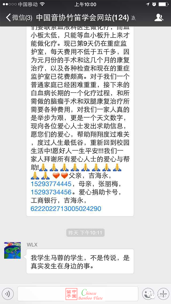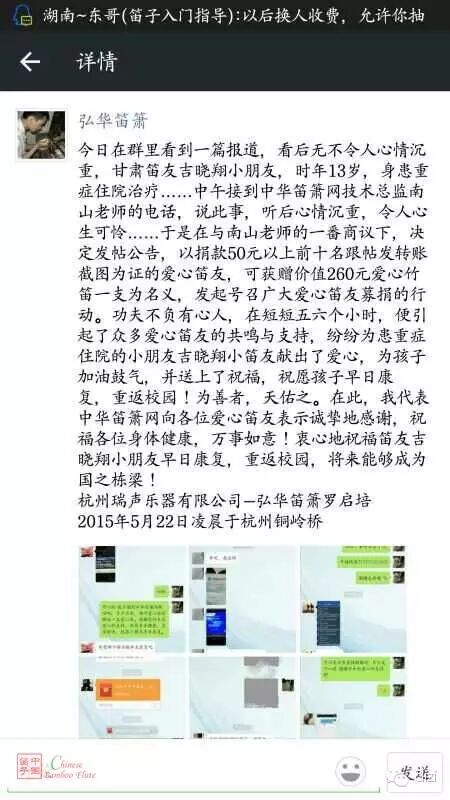 邢万里先生发布了一条爱心募捐消息:为正在与白血病抗争治疗的13岁小笛友吉晓翔募捐,此事已经过邢万里先生(著名笛子演奏家,四川师范大学音乐学院教授)、徐登朝先生(笛友之家创办人,《中国竹笛》杂志总编)、王建宏先生(杭州风雅宫乐器有限公司总经理)的证实为真实事件。
