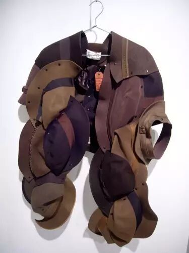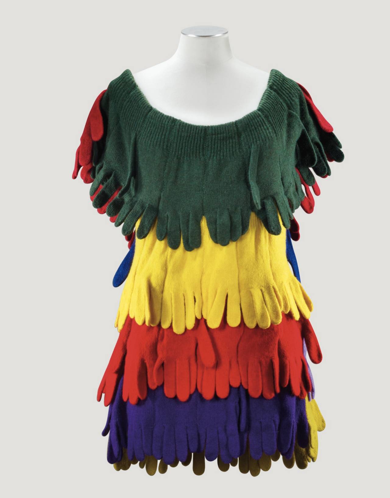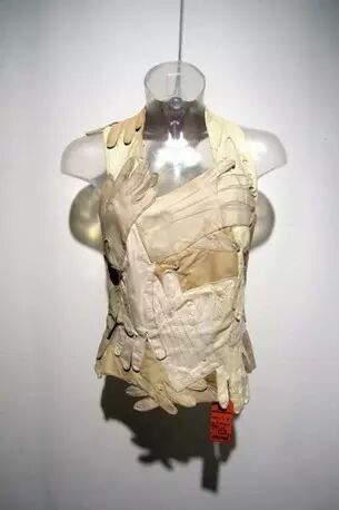 如今已被捧上神坛的解构主义设计师Martin Margiela最被人津津乐道的创作之一就是将大量重复的单品配件拼接组合成衣服。他在2004年秋冬系列中曾用十几只羊毛帽组合拼接成一件斗篷。Jean-Charles de Castelbajac早在1991年春夏系列就用一些列的巴拿马草帽制作了夹克。Martin Margiela在2001年春夏系列用二手皮手套组合出一件无袖上衣,而Jean则在1988年秋冬系列中用针织手套进行有序排列创作了一件女士毛衫。我们不在此讨论灵感借鉴的问题。从这两组构思相仿地作品中可以看出两位设计师截然不同的思考方式。Margiela有着近乎严苛的探索精神,对于解构这一概念无可挑剔的掌握,他创作出的是无机的近乎冷酷的先锋设计。而Jean则举重若轻,设计更加随性而童趣。正如法国人追求的effortless,反应在他对于色彩的大胆运用和结构上的随心所欲。