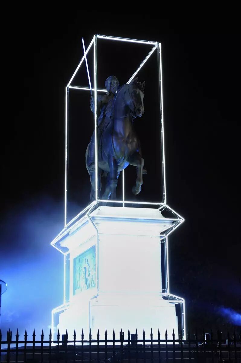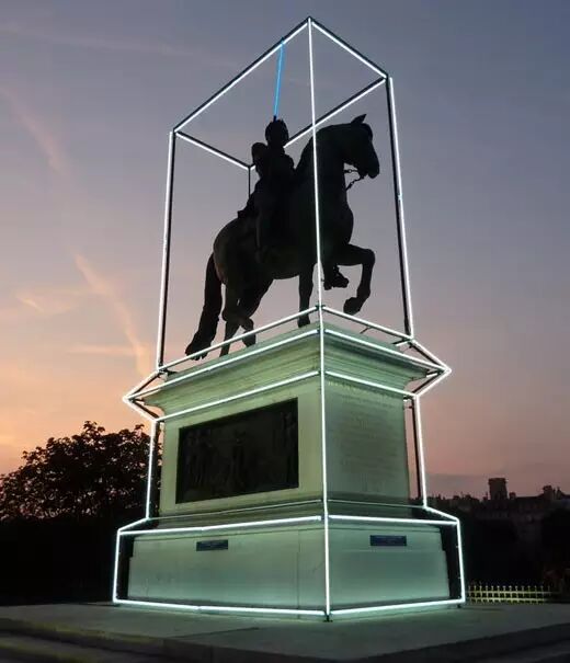 除了表演艺术和绘画,Jean-Charles de Castelbajac还为法国国王路易十四的四百年诞辰创作了装置艺术作品。他将位于瓦尔嘉朗广场的路易十四塑像作为创作的基础,在塑像周围架起巨大的霓虹灯。如何让当今社会捕捉这位国王?Jean希望能为这两者建立一种协同效应,同时他希望作品与光有关,所以设计师最终决定在这个特殊的场地用霓虹灯管给予塑像极广阔的维度。“我希望在这座城市最美的地方捕捉人们的注意力,虽然人们可能已经不在注意到这种美,但是这个地点是非常重要的,具有历史意义的”人们可以从各个方向看到这个作品,他就像伫立在巴黎的一座灯塔。为了创造出一种探照灯一般的效果,Jean甚至在塑像的手中放置了一把巨大的霓虹剑,直指天空。