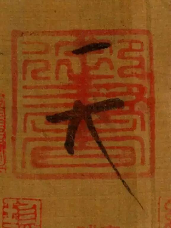 上图为宋徽宗“天下一人”花押及题款。花押,就是个人签名。它的外形,特别巧出心裁,有点像结构松散的“天”字,又像一个简写的“开”字,实际上是由“天下一人”四个字组成,四笔写成。