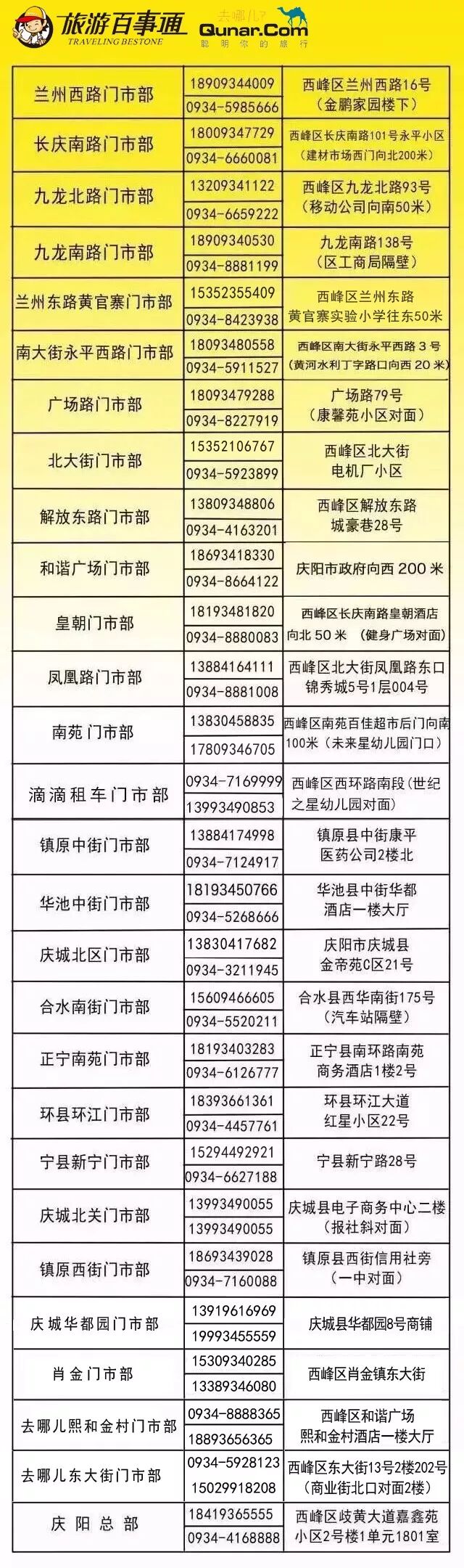 我社经营范围为:1、入境旅游 2、国内旅游;截止到现在我们已经成功在庆阳铺设27家旅游百事通及去哪儿营业网点,地址遍布庆阳各个县区。庆阳旅游百事通将以“正直、公平、信任、担当、谦和”为企业核心价值观,始终致力于实现“让旅游回归美好”的愿景!