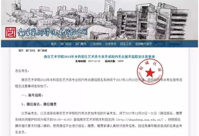 南京艺术学院2018年本科招生艺术类专业校内考点微信报名系统将于2017年12月20日开通。现将校内考点考生报考流程及注意事项告知如下: