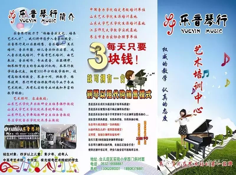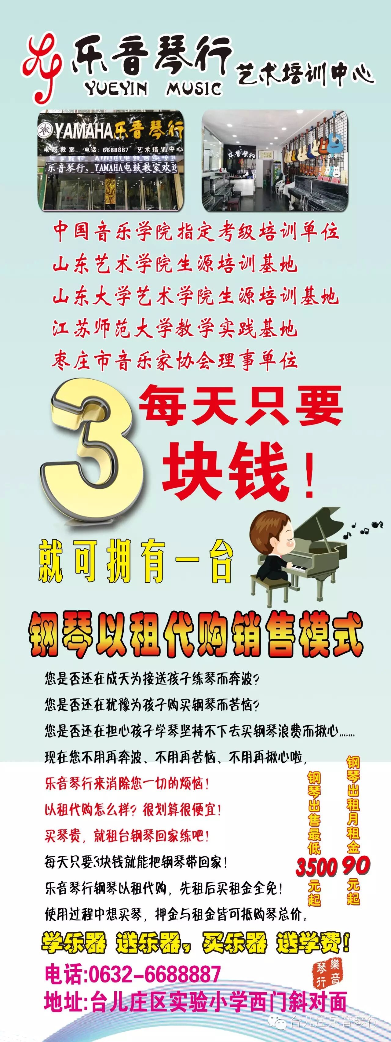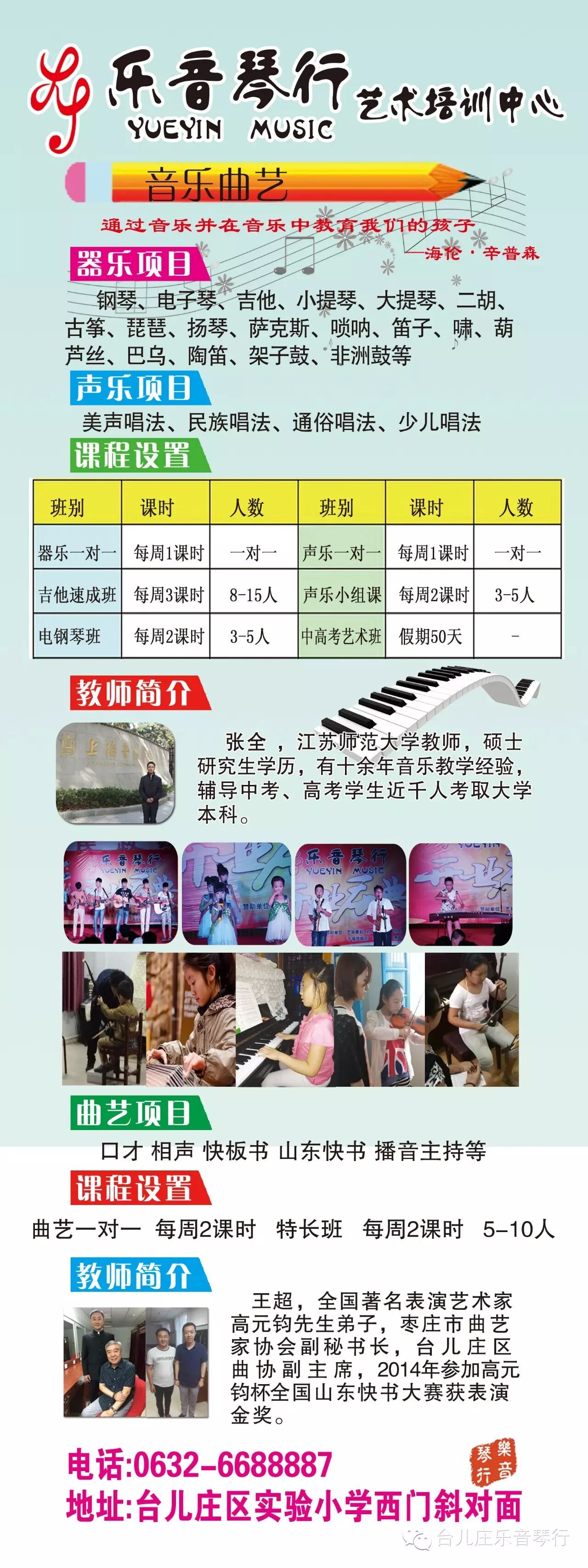 本琴行节假日不休息,热忱欢迎家长、同学前来参观咨询报名。地址:台儿庄区实验小学西门斜对面。电话:6688887。