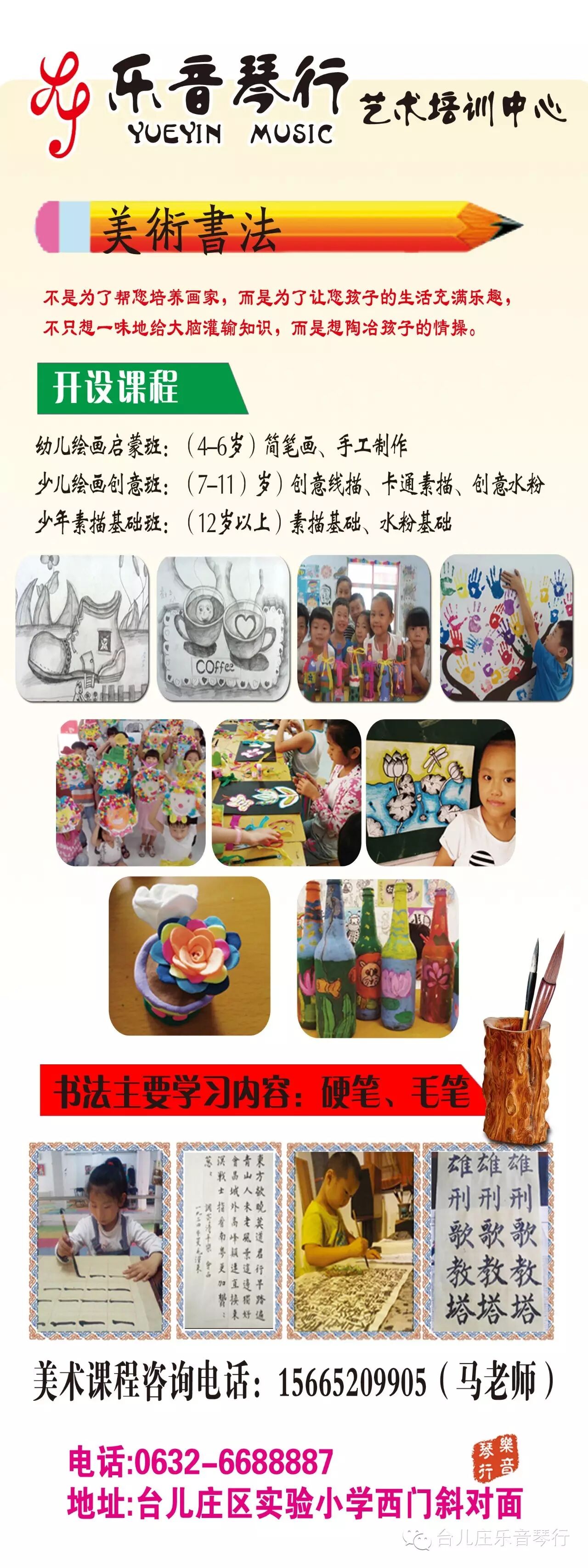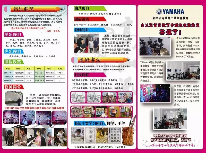 培训项目:器乐类(钢琴、电子琴、吉他、小提琴、大提琴、二胡、古筝、琵琶、扬琴、萨克斯、唢呐、笛子、萧、葫芦丝、巴乌、陶笛、架子鼓(YAMAHA电鼓)、非洲鼓等)声乐类(美声唱法、民族唱法、通俗唱法、少儿唱法)曲艺类(口才、相声、快板书、山东快书、播音主持等)美术类(简笔画、手工制作、创意线描、卡通素描、创意水粉、硬笔书法、毛笔书法等)本琴行常年销售中外知名品牌乐器。主要经营产品:钢琴,电钢琴,电子琴,吉他,古筝,二胡,琵琶,小提琴,笛子,葫芦丝,萨克斯,巴乌,架子鼓等。主要代理品牌:雅马哈钢琴,海伦钢琴,卡哇依钢琴,珠江钢琴,舒曼钢琴,雅马哈、罗兰电鼓,雅马哈、卡西欧、罗兰、美得理、吟飞电钢琴,爱尔科、美乐斯电子琴,敦煌、乐海牌民族乐器,凤灵、金音小提琴,马丁、卡玛、星辰、红棉吉他等知名品牌。
