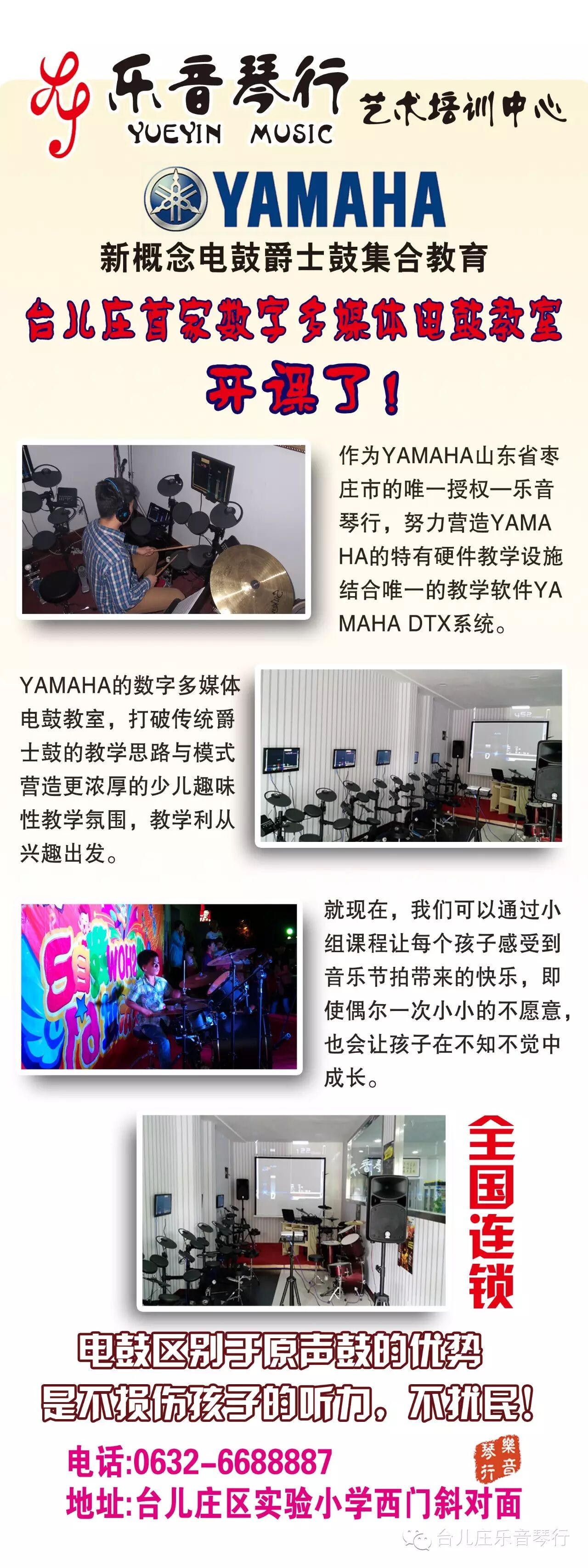 乐音琴行YAMAHA数字多媒体电鼓教室开课了!作为YAMAHA山东省枣庄市的唯一授权-乐音琴行,努力营造YAMAHA的特有硬件教学设施结合唯一的教学软件YAMAHA DTX系统!YAMAHA数字多媒体电鼓教室,打破传统爵士鼓的教学思路与模式营造更浓厚的少儿趣味性教学氛围,教学从兴趣出发!就现在,我们可以通过小组课程让每个孩子感受到音乐节拍带来的快乐,即使偶尔一次小小的不愿意,也会让孩子在不知不觉中成长!电鼓区别于原声鼓的优势是不损伤孩子的听力,不扰民!