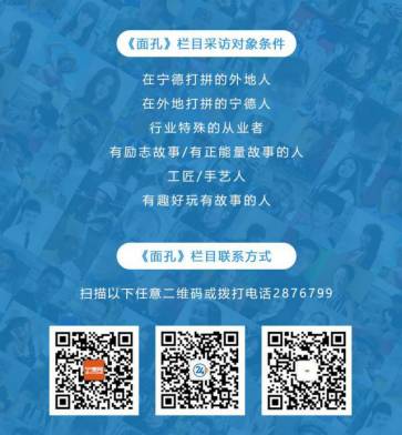 感谢对《面孔》栏目的关注,如果你的身边有在宁德打拼的外地人或者在外地打拼的宁德人,或者特殊少见的职业/有励志故事的人/有正能量故事的人/工匠和手艺人/有趣好玩有故事的人,可以都欢迎推荐给我们,我们希望让更多的人认识到这些朋友。