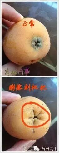 正是枇杷收获季节,购买枇杷要注意那些个大、光鲜的枇杷,那样往往使用膨胀剂(化学名细胞集动素),对植物可产生助长、速长作用,对人体危害主要是神经系统的危险,能造成儿童脑炎,发育不良,痴呆等。如何鉴定见图:上为正常,下为膨胀剂枇杷,区别看底部凸凹部分。