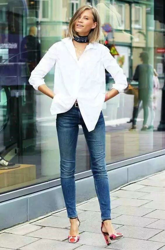 近年来白衬衫从最初的基本款发展到现在有了各种各样的小设计,例如V领设计,适合圆脸和脖子短的妹子用来拉长颈部线条和营造瘦脸效果;不喜欢V领款式的也可以解开衬衣的一两颗扣子,解放一下颈部,不会让整体看起来那么中规中矩~