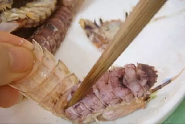 先把尾部最外面两个小脚拧断,然后捏着尾部轻轻往上一折,再拧掉