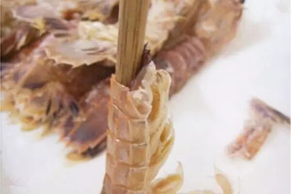 随后,用根筷子从尾部贴着虾壳插到头附近