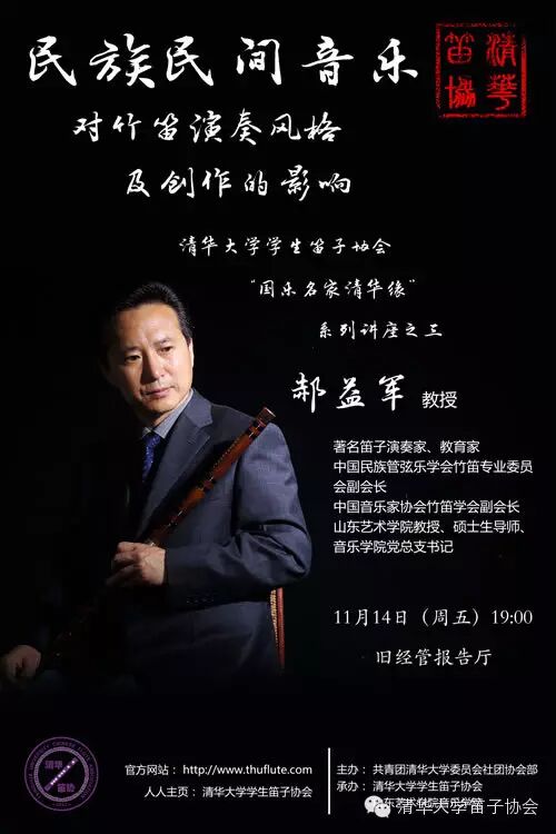 作为清华笛协的系列活动之一,“国乐名家清华缘”先后邀请过两位专家走进清华,与众笛子爱好者面对面交流,取得了很好的影响。本学期,我们很荣幸得邀请到了著名笛子演奏家郝益军先生,他将走进清华大学,与笛子爱好者共同分享竹笛的美妙。