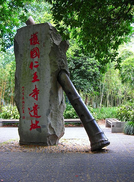 这是杭州护国仁王寺遗址上的石碑,穿插在石碑中的就是尺八,这涉及到一些故事,文末有链接可以浏览一下。