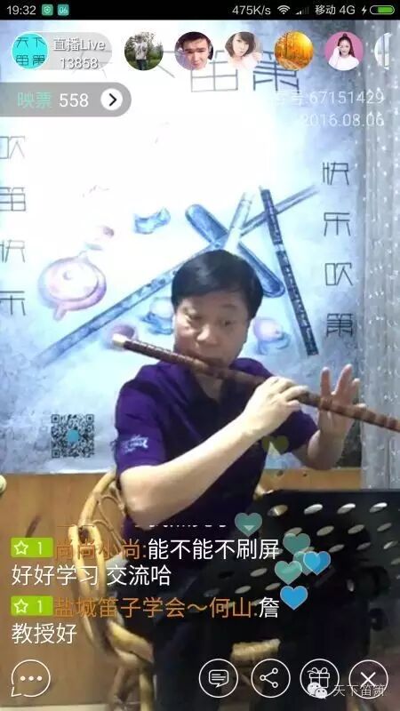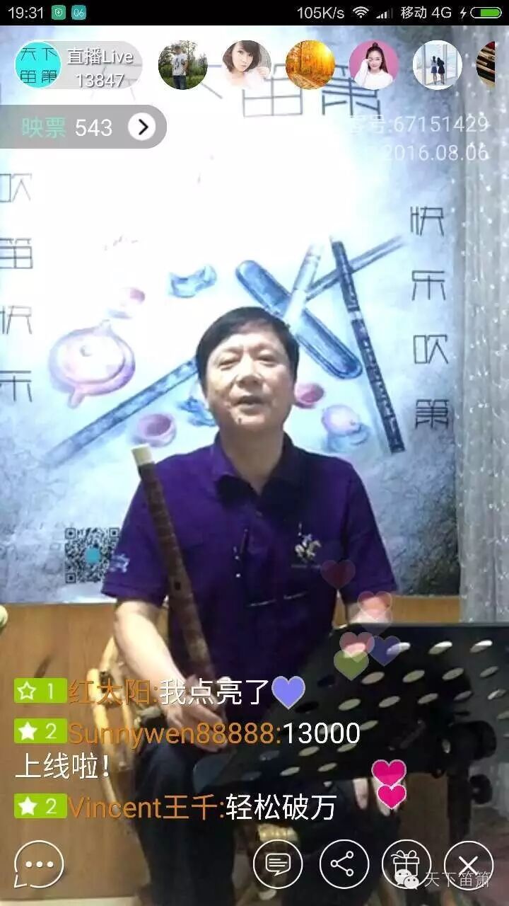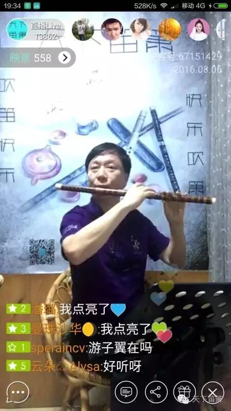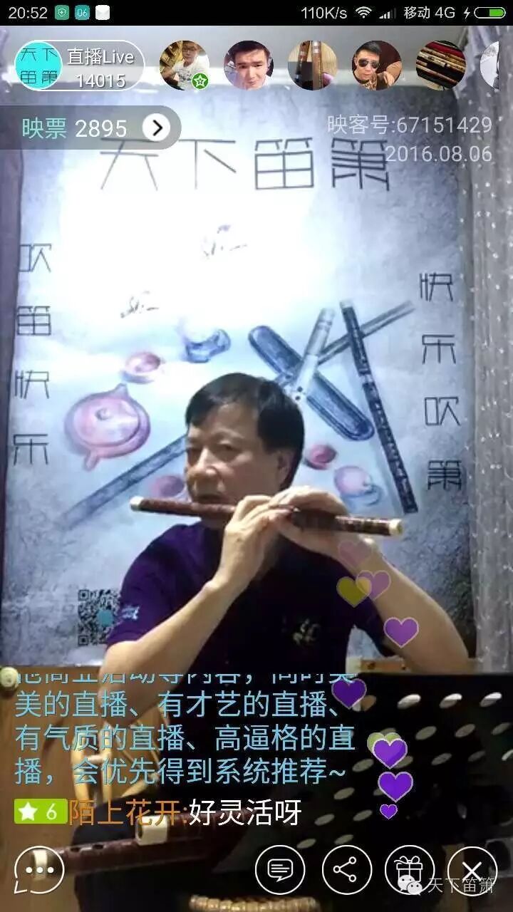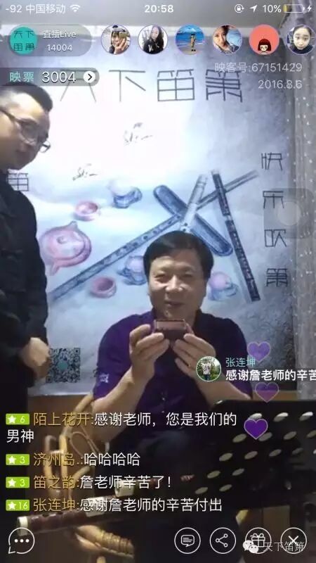 8月6日晚七点,天下笛箫举办的网络公益直播活动【天下笛箫人与名家面对面系列】荣幸邀请到笛坛名家上海音乐学院詹永明教授亲临现场!15677人观看过本次活动!这是笛箫界的一次新的形式,让天下笛箫人通过网络,与名家面对面进行交流。这也是天下笛箫团队的尝试性举动,虽有设备不足、安排不妥、没有提问到所有观众的问题等等不成熟的地方,但本次活动还是取得了圆满成功!