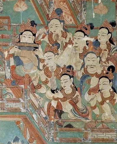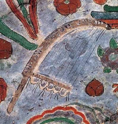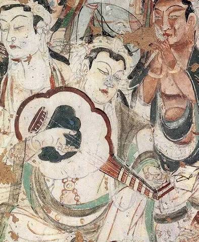 阮弦归属琵琶之类。该词出现在唐代。缘于晋代竹林七贤之一的阮咸善弹这件乐器,因而得名。形制上,共鸣箱呈正圆形。项长,四弦,十二品柱。它与五弦琵琶有着极其相似的命运。唐朝以后开始逐渐失去主流地位,之后被宋代的月琴所取代。然而,敦煌壁画中却留下了大量它的身影。有的琴体饰以花纹重彩,有的琴体却形似花瓣。图为西魏第285窟南壁。