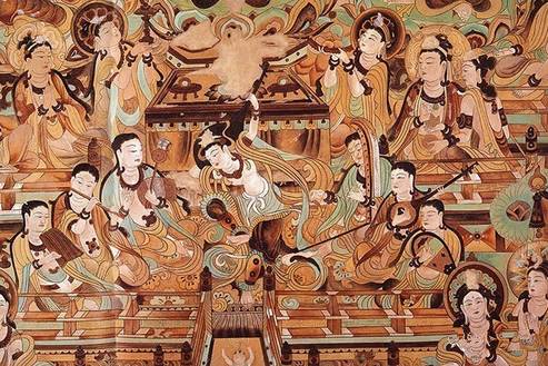 经历北凉至元十个朝代的莫高窟,在近千年的历史轨迹中所留存下的洞窟共有492个。其中,与音乐题材相关的洞窟多达240个,约占整体数量的一半。接下来我们按乐器的演奏方式精选一些敦煌乐器,对应美轮美奂的各朝壁画,进行一番微考据。