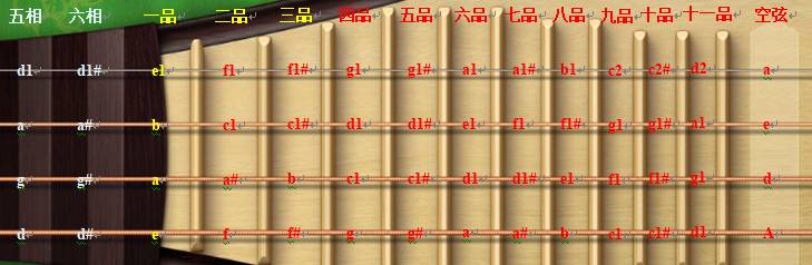 同一弦品(相)与品(相)之间音符音程为小二度,具体的音符位置见下图: