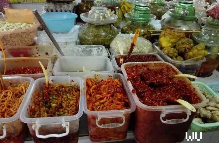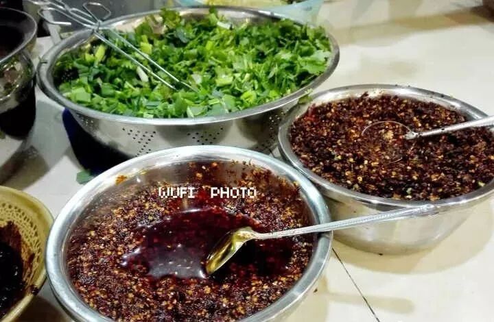 海椒鮺(川渝及遵义两地管辣椒叫海椒,遵义因为历史上属于四川,口音和很多当地用语都接近四川话。这个鮺(zhǎ)字也是方言,有点类似北方说的粉蒸,但不完全类似):将新鲜小辣椒剁碎之后,加上红苕丝和鮺面(用一种本地称之为zhān米的大米炒熟,打成米粉),放入适量的盐,一起拌匀,放进泡菜坛,泡菜坛口还要用干净稻草塞住,倒置泡菜坛腌制。吃的时候取出需要的份量,先蒸熟,然后下锅加上油渣,蒜苗烹炒。腌制时间久了,酸味甚至盖过辣味,也是无敌开胃菜!