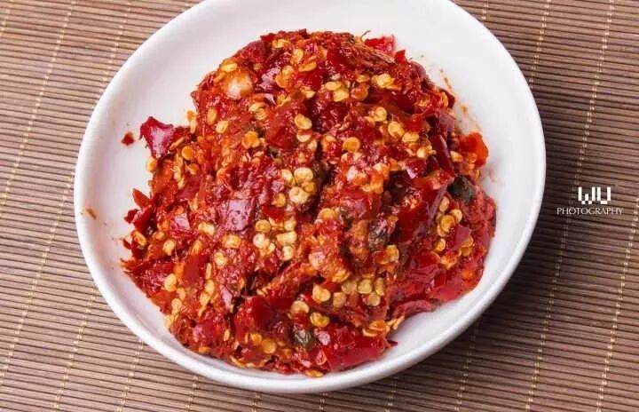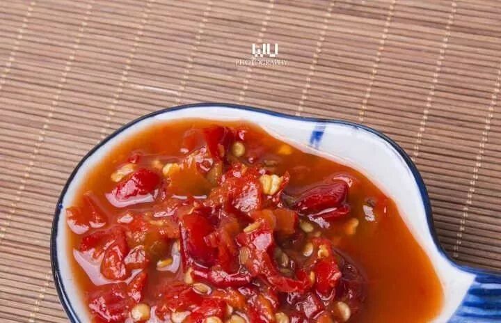 有用新鲜辣椒研磨制成的辣椒酱,只能用最早上市的嫩辣椒来做,所以量很少。味道非常鲜辣带一丝甜味,用筷子挑起一点放进嘴里,一股清香瞬时溢满口腔和鼻腔。