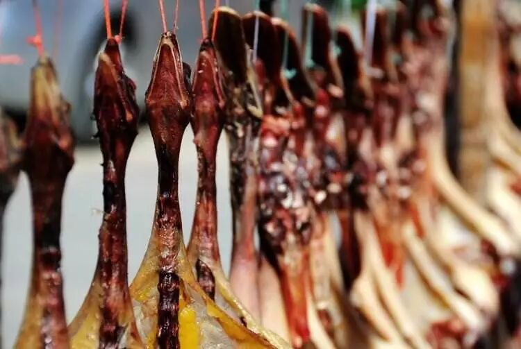 广府人戏称人上吊,就会说是“挂腊鸭”,比喻非常形象,不信,你去腊味铺看看,那些腊鸭是怎样被人吊着出售的。