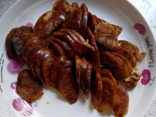说到腊肉,当然不能不提到香肠。入冬以后,家家户户都会割上30来斤半精半肥的猪肉。用刀剁或用机器将肉绞碎,加适量的食盐、生姜米、料酒和水,并调以五香粉、味精等佐料,灌入洗净的猪小肠内,用筷子塞紧,扎紧两端,扎成一节一节的,放着风干或者用火熏干。