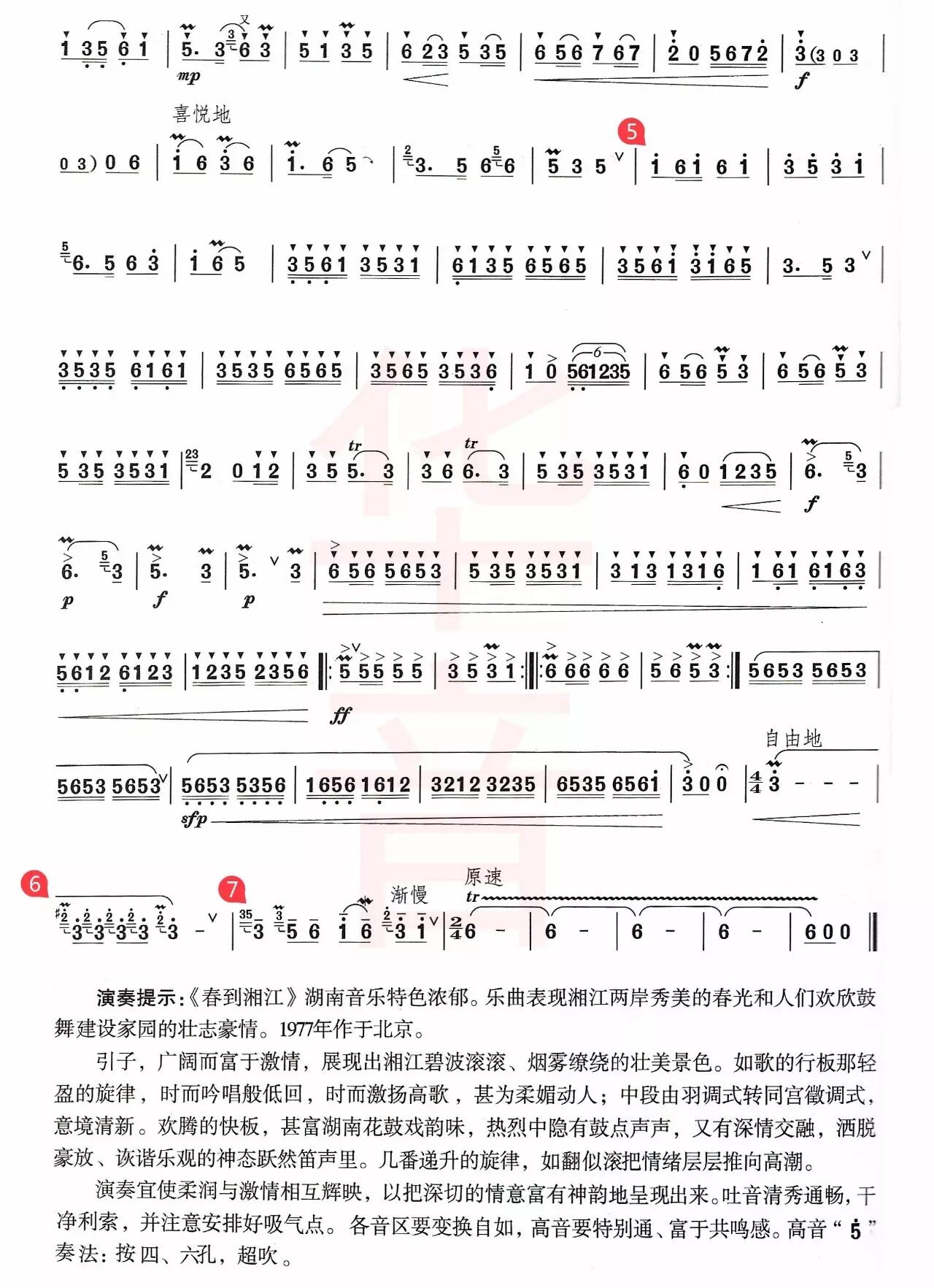 行板:想象自己身处湘江之中,欣赏两岸的风景,把情感投入到吹奏中;注意三度的加花,回来加上二度的小加花;