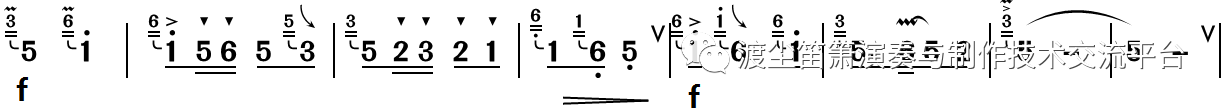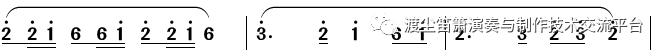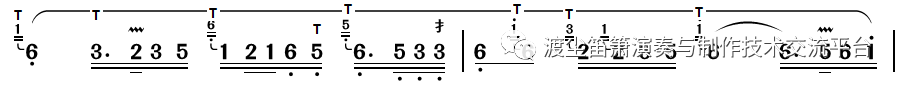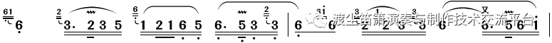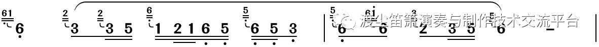 关于乐句中的吐音与连音的区分,现今大部分竹笛曲谱都没有标明,而这又是非常关键的一点。前文已经说到,在乐曲演奏中,连音和吐音用法很灵活,所以何时该连,何时该吐,应仔细推敲,听示范录音是一个直接有效的途径。