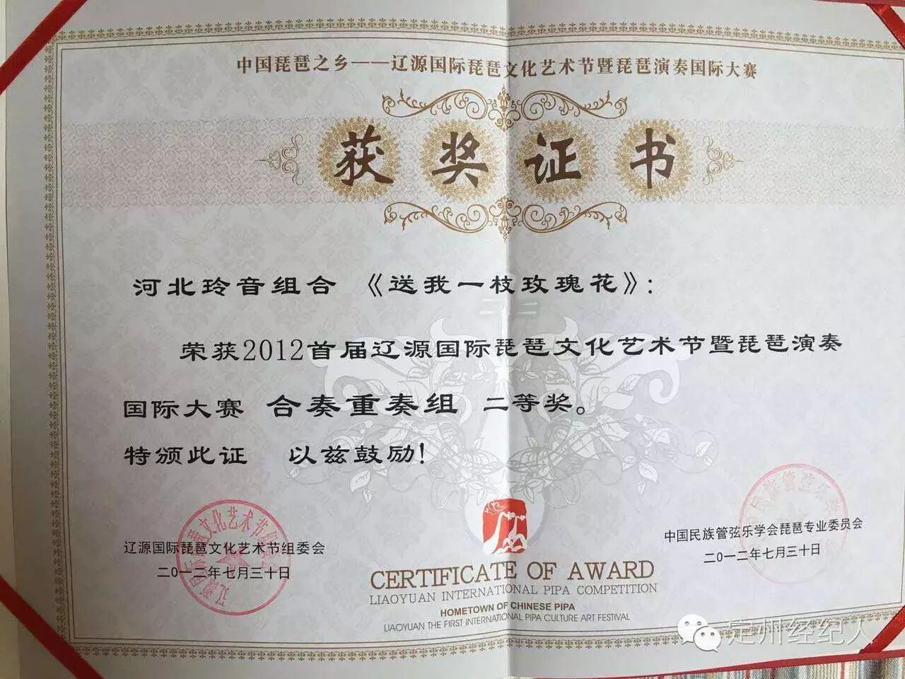 获首届国际琵琶大赛银奖
